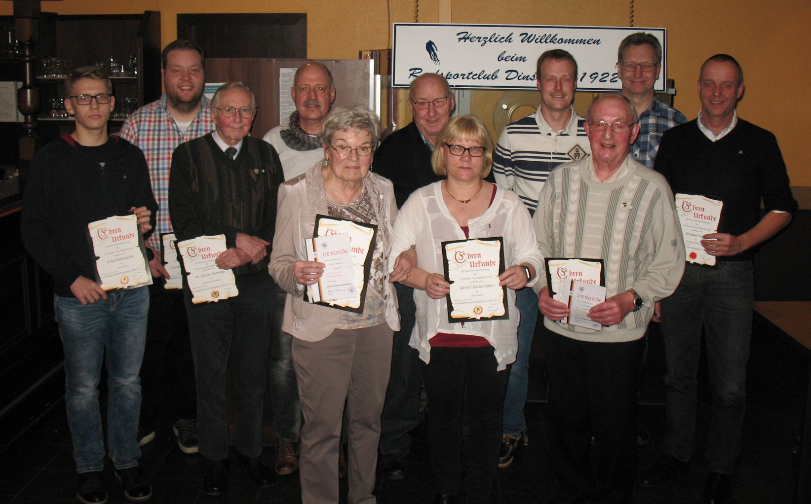 Auf dem Foto: Für ihre langjährige Treue zum Radsportclub Dinslaken wurden etliche Mitglieder des RSC durch den alten und neuen ersten Vorsitzenden Dirk Kottenhahn (2.v.r) und den zweiten Vorsitzenden Peter Gockel (4.v.r.) ausgezeichnet.