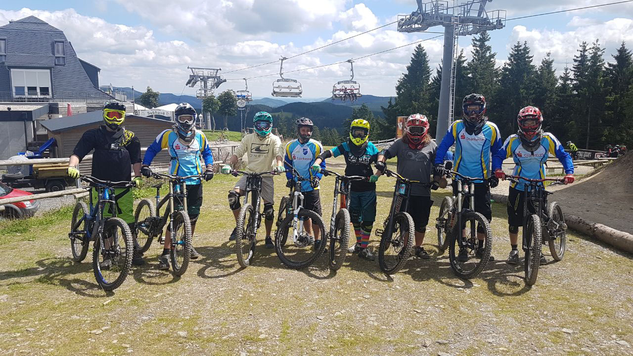 Auf dem Foto: In voller Montur zeigten sich die acht Teilnehmer des Downhilltrainings in Winterberg der Kamera. Bei fast perfektem Wetter konnten mit viel Spaß an der Sache erneut etliche Abfahrten in Angriff genommen werden.