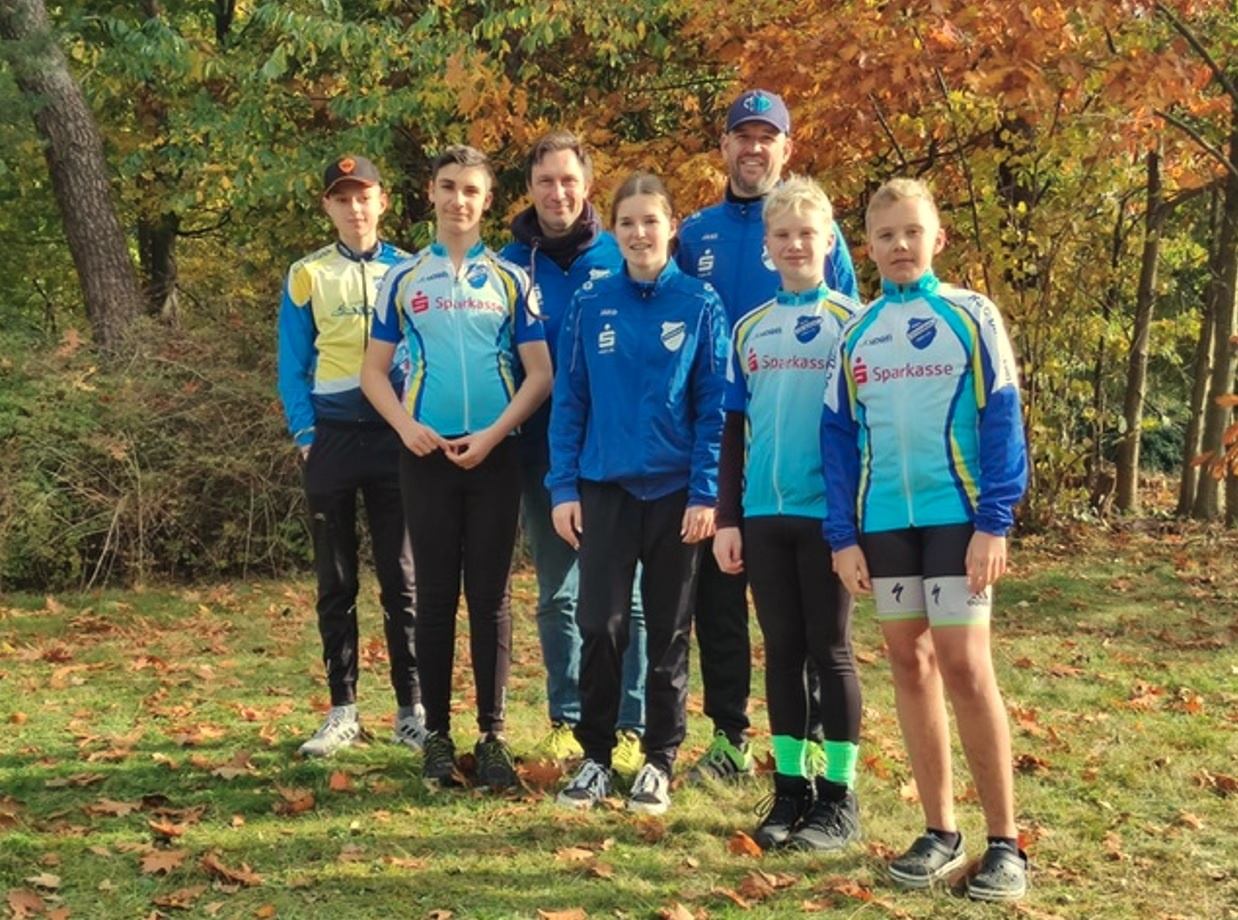 Ganz neue Rennerfahrungen sammelten die Jugendlichen vom Radsportclub Dinslaken zum Saisonende in Marl bei einem Mountainbike-Rennen. Beim erstmals durchgeführten „Haardbiker End of Season Race“ am 31.10.2021 galt es einen 3,5 Kilometer langen Rundkurs mehrmals zu bewältigen. Anders als auf dem Rennrad waren dabei mit dem Mountainbike auch Wiesen- und Waldpassagen mit Wurzeln zu bewältigen und die Jugendlichen konnten so gut zeigen, was sie im Sommer gelernt hatten. In der Klasse U13 gingen für den RSC Dinslaken Pablo Dienefeld Gomez und Jonathan Stobbe an den Start. Durch ihre erste Teilnahme an so einem Rennen wurden die beiden Fahrer in der Startaufstellung ganz hinten eingereiht. Pablo kam beim Start gut weg und reihte sich nach den ersten 400 Metern schon auf Platz 3 ein. Jonathan hatte zu kämpfen und wurde von den gegnerischen Fahrern immer wieder blockiert und abgedrängt. Aber auch er konnte sich während des Rennens Platz für Platz weiter nach vorne kämpfen. Pablo musste leider in der Mitte der zweiten Runde seiner hohen Anfangsgeschwindigkeit Tribut zollen und fiel auf Platz 8 zurück. Ab der dritten Runde war dann auch Jonathan zu ihm aufgeschlossen und die beiden wechselten sich anschließend mit der Führungsarbeit ab und fuhren auf den Plätzen 8 und 9 durchs Ziel.