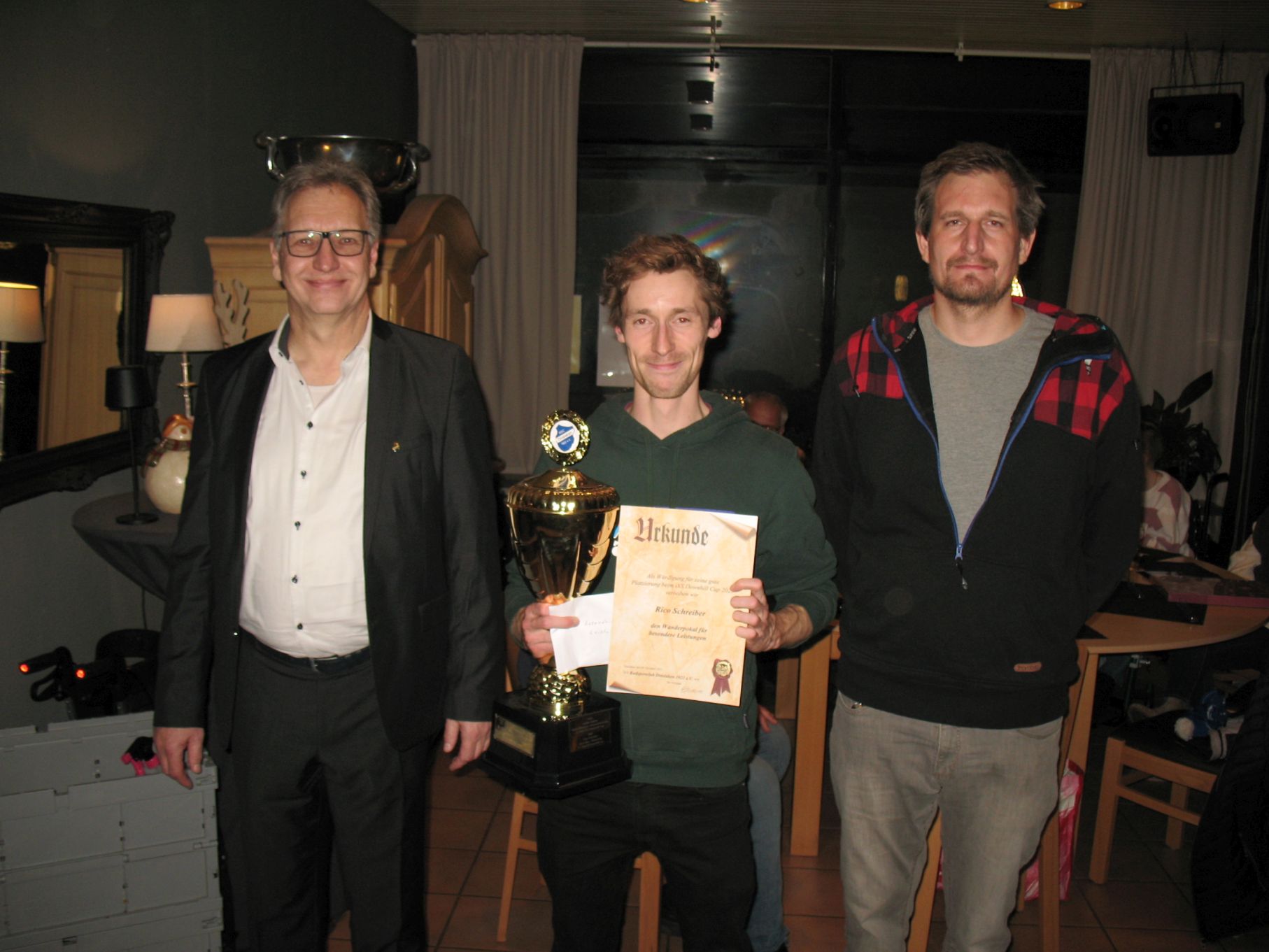 Auf dem Bild: Rico Schreiber (Bildmitte) erhielt in diesem Jahr die Auszeichnung für besondere Leistungen: eine sehr gute Platzierung beim international besetzen iXS-Downhillcup sowie weitere sportliche Erfolge. Ihm gratulierten der erste Vorsitzende des Radsportclubs Dinslaken, Dirk Kottenhahn (links) und der zweite Vorsitzende David Untervoßbeck.